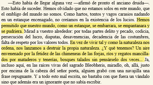 Por último, y no menos importante, me gustaría mencionar un pequeño monólogo de un druida, el cual no es relevante en la narración, pero sí en al realidad del lector. Parece que el autor habla en ese momento, advierte al lector de los peligros de considerarse superior. Para qué luchar si se acabará gobernando entre cenizas y polvo.