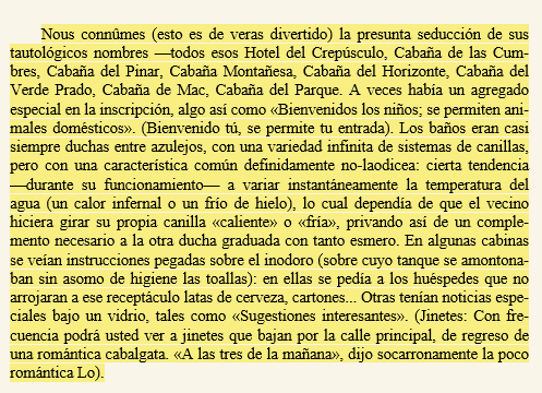 Por su parte, el espacio se basa en las descripciones topográficas, como vemos en la imagen anterior, aunque no olvidemos que la casa de Charlotte y Lolita es un espacio principal para la obra pues en ella se realizan las acciones principales. Del mismo modo considero que el lago cercano a la casa citada es, en su modo, relevante; en el Humbert comienza a desarrollar unos pensamientos más criminales ya que imagina como podría acabar con la vida de su esposa en ese mismo lugar.