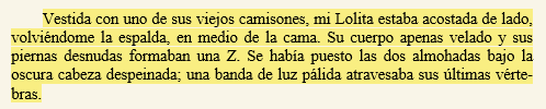 «Lolita, luz de mi vida, fuego de mis entrañas. Pecado mío, alma mía. Lo-lita: la punta de la lengua emprende un viaje de tres pasos desde el borde del paladar para apoyarse, en el tercero, en el borde de los dientes. Lo.Li.Ta. Era Lo, sencillamente Lo, por la mañana, un metro cuarenta y ocho de estatura con pies descalzos. Era Lola con pantalones. Era Dolly en la escuela. Era Dolores cuando firmaba. Pero en mis brazos era siempre Lolita.»
